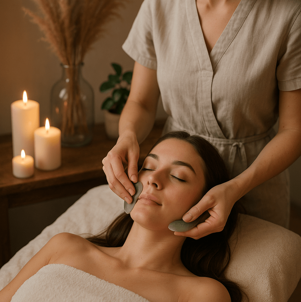 Guasha využívá nefritové destičky speciálně vytvarované pro obličej, kterými provádím jemné tahy po pleti. Tímto způsobem aktivuji mikrocirkulaci, stimuluji lymfatický systém a uvolňuji napětí v obličejových svalech.
